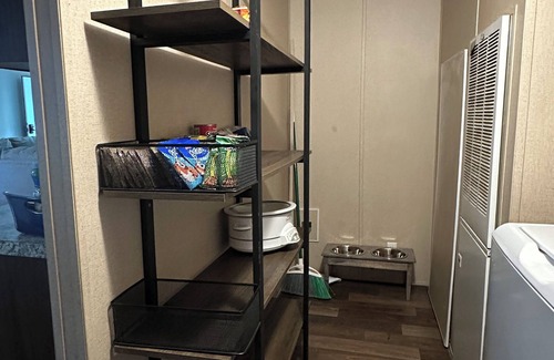 There is a large fully stocked kitchen. Even crock pots. There are 10 seats at two dinning tables for the comfort of our guest.