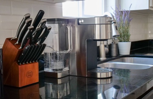 The kitchen is fully stocked and features a gas range, Keurig coffee maker with complimentary coffee, stainless steel appliances, a stocked spice rack, and ample prep space for cooking.