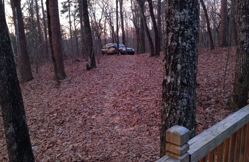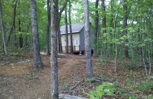 To get to the cabin you will follow a gravel road approximately 0.5 miles to the property. The driveway is gravel and some concrete. It is approximately 0.25 miles long and traverses a steep hill. The entire area is heavily wooded... and, beautiful.