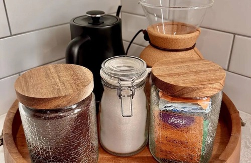 KITCHEN 👩🍳: The kitchen is fully stocked with new stainless steel appliances (microwave, dishwasher, gas stove), toaster, blender, pots, pans, wine glasses, pour-over coffee maker, electric tea kettle, plus tons of cooking utensils. The kitchen island can seat up to 4 for group dinners or a fun game night. Plus there is a bistro table for additional dining space.