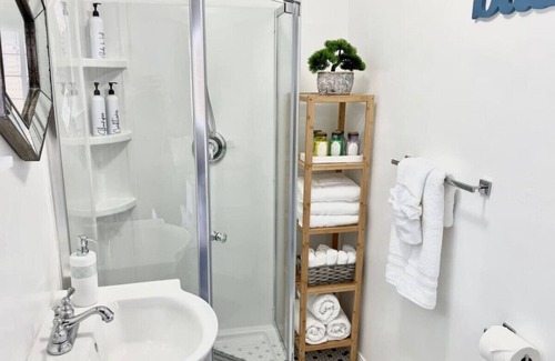 Our newly renovated bathroom is stocked with all the essentials, a hair dryer, and toiletries.