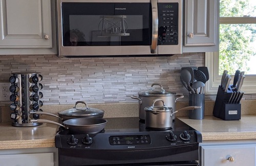 The two guest rooms have queen-sized beds with brand-new memory foam mattresses. Each closet has extra linens, a folding desk for an option for remote workers, and an extra rollaway bed.