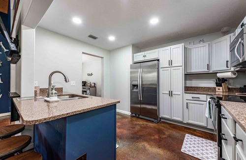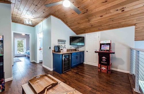 Inside there are 3 bedrooms...2 downstairs & the primary upstairs. 2 King beds, 1 Queen. Loft area can also accommodate an air mattress for additional guests. There are 2 standup arcade games in the loft, NBA Jam & Marvel vs Capcom/X-Men. Electric fireplace in living room. 3 Amazon Alexas located throughout the home for music.