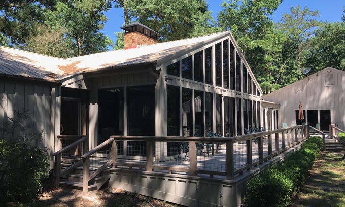 Our Hidden Pines Lodge is a wonderful place to have a relaxing vacation away from it all! This secluded lodge was fully renovated in Spring 2017 and is located at the Hawkeye Hunting Club in Center, Texas. Hidden Pines has six bedrooms with private bathrooms, all on one level. Two bedrooms have two XL double beds; the others have two queens . All rooms have DIRECTV. The lodge boasts a kitchen, spacious living room and game room complete with a pool table and other assorted entertainments. Internet service (wi-fi) is available at the lodge. The lodge also has its own deck and fire pit area; the property's community swimming pool is located a short walk away on the other side of the lake. There are two lakes on property available for fishing or canoeing if you so desire. Toledo Bend, one of the largest bass lakes in Texas, is only a 20 minute drive from the lodge.. Additionally, we also offer (at an extra cost) a 5-stand (clay shooting) and sporting clay course. Antique shopping and other attractions are also available in the nearby town of Center Texas. Hidden Pines Lodge is a great place to have your next family or multifamily vacation. Give us a call and come relax with us at Hawkeye! Check in is after 2 p.m and checkout is 11a.m.