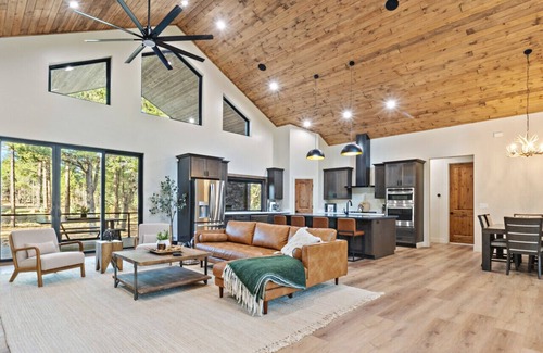 Escape to Hidden Pond Retreat, a serene vacation rental in Torreon, Show Low, AZ. This newly built haven boasts a king primary suite and two queen bedrooms downstairs with a 4th bedroom upstairs with two twin-over-full bunk beds. 3 complete bathrooms, a beautiful great room, a private dedicated office space, and breathtaking forest views. Step outside to your private oasis with a tranquil pond just beyond the back door. 5 minute drive to restaurants and shopping. Paradise awaits!