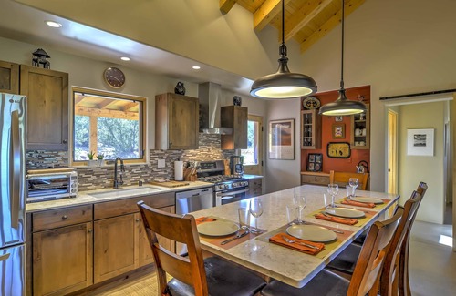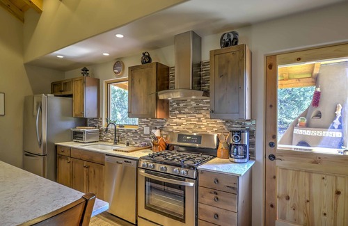 Escape and relax at this rustic but modern 2-bedroom, 2-bath vacation rental home! The Santa Fe retreat accommodates outdoor enthusiasts, museum-goers, and everyone in between. The close proximity to countless attractions, spectacular views of the Sangre de Cristo and Jemez Mountains, and comfortable amenities provide a memorable getaway. With white granite counters, a gourmet kitchen, covered front porch and shaded back porch with a kiva fireplace, this is the ultimate New Mexico escape!