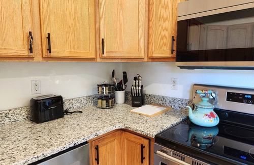 Inside you will find your master bedroom sanctuary with a king bed, along with a large guest bedroom with a queen bed and the space for the luxury bed height queen air mattress if needed, a living area with a queen sleeper sofa to watch TV, and a full bath on the upper level. Downstairs there's a 1 car garage for your vehicle, stackable laundry machines, a half-bath, and an open concept kitchen with eating area and a TV to watch your favorite shows while cooking and enjoying your meals.