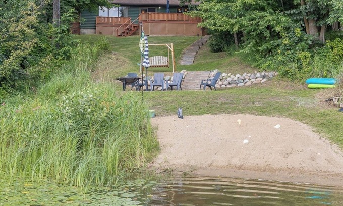 Private dock with space available to tie up your boat. Paver patio overlooking beach/lake with chairs, umbrella, and off the ground round fire pit (this can only be used on days that campfires are allowed per MN DNR – firewood available for purchase in local towns).