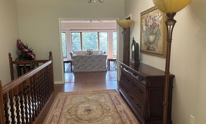 The hideaway is tucked away on a dead-end, sitting on bluff overlooking the Ohio River. Large house with two living areas & bonus lounge room and sunroom; master suite complete with a jacuzzi tub in the ensuite, and three other bedrooms with their own attached bathroom, a well as a kids room with loft bed, and a hall half bath. Hideaway has a large eat in kitchen with a separate dining room, making it the perfect rental for family gatherings and holidays.