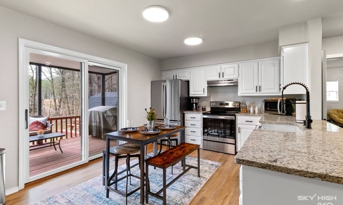 - Fully Equipped Kitchen: The modern kitchen comes fully stocked, allowing you to prepare meals for your group. Enjoy outdoor dining with patio furniture and a picnic table under the Arkansas sun.