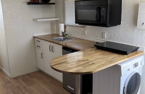 A highly functional studio is equipped with coffee maker, air fryer oven, microwave, induction cooktop, and full-size refrigerator. Two in one washer dryer unit. Off street parking with private access to apartment and a small patio area for outside enjoyment.