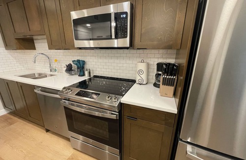 We are a stylish single bedroom unit with a luxurious King-sized Kingsdown Gold Mattress for an amazing restful sleep. A foldable crib is always available for little ones. There are black-out blinds on the living room and bedroom windows. All the cooking tools and some basic cooking ingredients (salt/pepper, coffee, assorted tea, cooking oil) to make up a fully stocked kitchen. We provide a drip coffee machine, as well as a french press. We provide all towels and linens. Hairdryer. Soaps, Shampoo/conditioner. A queen-size sofabed can accommodate 2 additional guests (additional fees apply for additional guests. If only two guests are staying, and decide to use the queen bed linens; an additional laundry fee does apply).