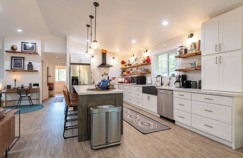 Guests rave about how well-appointed the chef's kitchen is. With its extra-large island for prepping and dining, a Samsung range with a 5-heating-element cooktop, and all the kitchen utensils and bakeware you could need, you will be sure to create many delicious meals during your stay.
