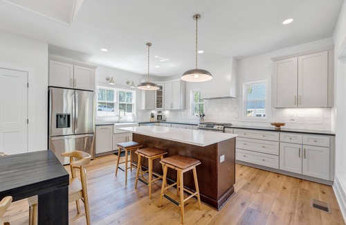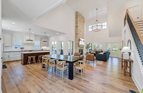 The home boasts an array of exceptional features that cater to large gatherings, including a private heated saltwater pool, an 8-person hot tub, and spacious covered decks ideal for hosting both ceremonies and receptions. Gather around the gas fire pit or relax on the large dock which accommodates boats and swimming activities. Inside, you'll find a contemporary open floor plan with abundant natural light, a well-equipped kitchen for group dining, and multiple entertainment areas—including a game room that opens to the patio. Each of the seven bedrooms provides comfortable accommodations, with linens and towels provided for your convenience.