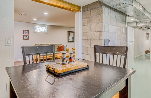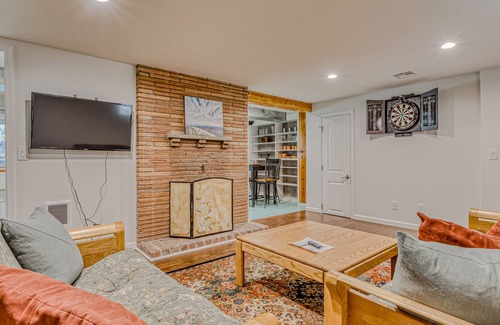 The inviting interior is lovingly furnished for at-home comfort and convenience, with modern essentials including central AC and free WiFi. The kitchen comes equipped with all the major appliances you need for planning meals during your stay and there's seating for up to four at the eat-in dining table. Enjoy home entertainment in the living room with a classic board game, a few rounds of darts, or stream your favorite shows and movies on the wall-mounted smart TV.