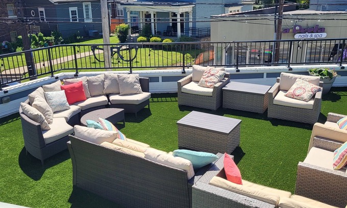 Huge 1300 sq ft rooftop deck overlooking the always eccentric bardstown rd! Large rear rooftop deck for relaxing with a book from the array of choices located throughout house.