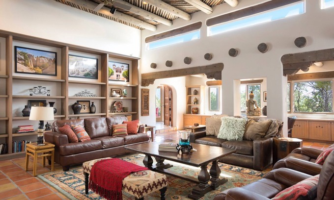 Welcome to High Desert Hacienda, an exquisite 6-bedroom, 5 1/2-bathroom rental that provides the perfect setting for your wedding celebration. Nestled just minutes from the iconic Santa Fe Plaza, this beautifully-appointed home boasts over 6000 square feet of space, combining luxury with the enchanting charm of New Mexico's landscape. Its stunning backdrop of the Sangre de Cristo Mountains offers an idyllic atmosphere for exchanging vows and hosting unforgettable gatherings.