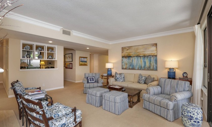 This fully furnished, luxury townhome is spacious and has a covered patio overlooking one of Sea Island’s lagoons.