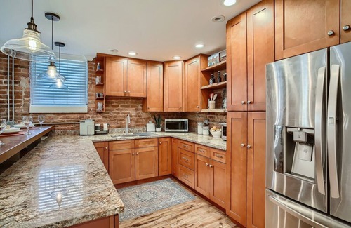 All the design choices are curated to create a luxurious-yet-comfortable look. Exposed brick walls in almost every room, high ceilings, an incredible bar top made from a cross-section of a 180-year-old oak tree (floating shelves in the kitchen came from the same tree!), wide granite countertops (so much counter space!) and high-end tall cabinets, stainless steel appliances. A 75-inch TV with built-in surround-sound system provides captivating entertainment in the cozy living room space, with a 2nd, 60-inch TV at the foot of the king bed in one bedroom. The shower has three shower heads, including a large "rain" style head directly above. In-unit laundry machines mean that you can stay comfortably, even on an extended visit! One bedroom contains office/desk space, and the whole property has free and fast wi-fi access, perfect for those guests who work remotely.