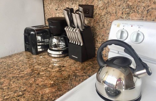 Kitchen - The kitchen is designed with an efficient work triangle and a parallel counter layout, ensuring easy movement in this dynamic space. Equipped with essential appliances like a full-size refrigerator, stove oven, microwave, and dishwasher, coffeemaker, along with basic kitchenware: cookware, cutlery, dinnerware, and drinkware for your cooking and dining needs. Your workstation shines with natural light, creating an enjoyable environment for whether it's food prepping or washing the dishes.