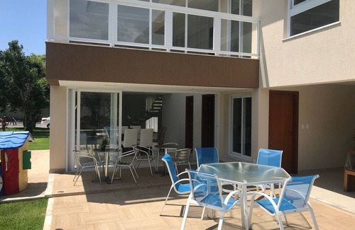 House with 4 suites, with air conditioning in all suites, double beds in all rooms, still accompanies 4 single beds. Blinds with acoustic protection and automatic curtain in two suite. Pool, gourmet space, with barbecue, freezer, brewer, and cable tv. Upper balcony facing pool. Home with cable tv. Service area with maid's dependence. A toilet and a pool toilet. Living room and dining room.