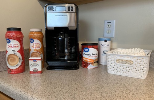 Kitchen is stocked with everything you need to cook a large family meal on the ceramic top stove. Dining room seating is right off the kitchen, as is the full size Washer and Dryer for those longer stays.