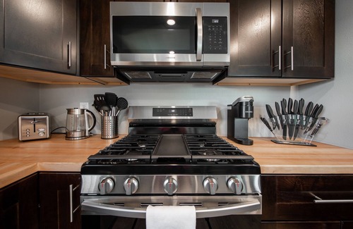 While you're here, you can enjoy all the comforts of home and more, including a rainfall showerhead and a full-sized refrigerator/freezer, as well as an oven and a stovetop. Other amenities include a pillowtop bed, laundry facilities, towels, and a DVD player.
