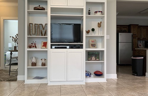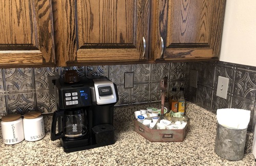 The kitchen is equipped with everything you need to prepare meals or to prep for tailgating. We will make your mornings great with our coffe bar! Enjoy your coffee while sitting on the porch which overlooks the grassy courtyard.