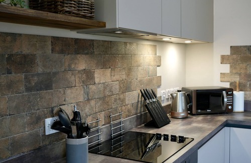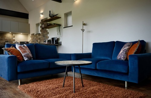 The main kitchen/dinning/living area - Open plan with floor-to-ceiling windows and a vaulted ceiling with steel beams. The new kitchen is well equipped and has a large oven/grill, electric hob, microwave and fridge. There is a comfortable dining area and lounge area for up to 6 adults with Smart TV. For warmer days there are French Doors leading to a patio and a garden snug area to enjoy the outdoor space and BBQ. And for cooler winter days, The Bull Pen is cosy with constant thermostatic underfloor heating and large triple glazed windows so you can still enjoy the view of grass, trees and big sky.