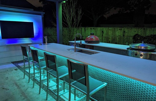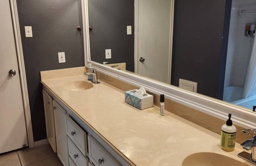 Enjoy a peaceful stay at this delightful 2-bedroom house in Houston. This lovely property offers a cozy atmosphere that will make guests feel right at home. The bedrooms feature a comfortable king bed and a bunk bed, ensuring a good night's sleep for everyone. With 3 bathrooms, including amenities like a hair dryer and a bidet, getting ready in the morning will be a breeze. The house also provides AC, an iron, a washing machine, WiFi, and heating. Our place is equipped for both long or short stays to make your holiday one to remember. There are three TV's, one in the master bedroom, one in the kitchen and one outdoors. The outdoor TV has immersive lighting that transforms the entire patio.