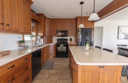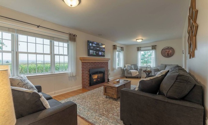The living room has a smart tv and a gas fireplace, with amazing views of the surrounding farmland. The large dining room adjoins with the kitchen for an open concept space perfect for enjoying family meals together. Off of the kitchen is the sunroom with the queen size pullout couch, and also leads out to the screened in porch.