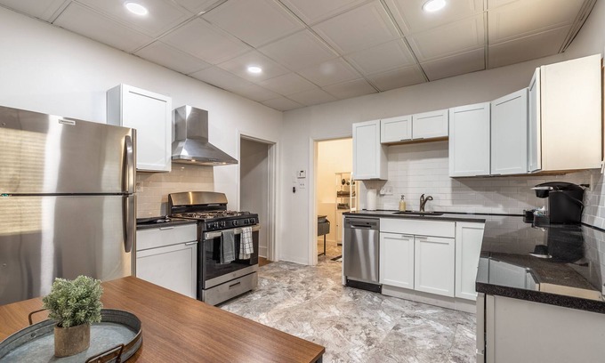 Welcome to your chic urban escape! This newly renovated space exudes modern charm and functionality. The unit invites you into a bright and airy living area complete with a large flat-screen TV, perfect for relaxing after a day of exploration. The kitchen boasts quartz countertops, contemporary white cabinets, and stainless steel appliances, including a Keurig coffee maker with complimentary pods for your morning brew.