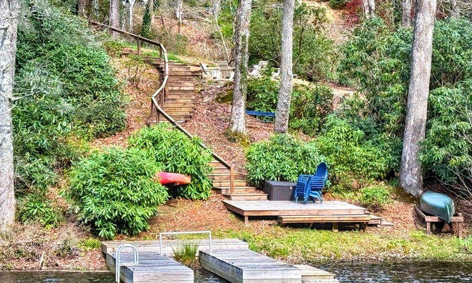 Down the well- lit stairs between the home and the dock, enjoy the amazing stone fire pit landing where you can gather around in the comfy rocking Adirondack chairs with friends or family, roasting marshmallows and sharing stories under the stars. The private dock provides easy access to the lake, and for those looking for adventure, a canoe and kayak are available for your enjoyment. Explore the serene waters of Lake Sequoyah and take in the stunning natural beauty surrounding you.