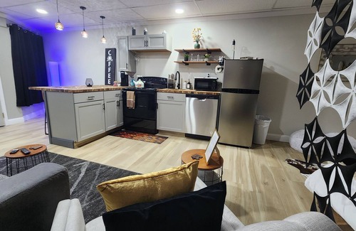 Comfy/private side by side ONE LEVEL DUPLEX with Queen size bed with 4 drawers for storing clothing. Full size tiled shower with Delta brand, superb, water pressure shower head, including detachable wand. Full kitchen with range, dishwasher, refrigerator, complete kitchen tools/utensils. Full size front load Samsung washer n dryer in unit with complimentary detergent. Queen size self inflating mattress available upon request for over 2 guests only. Complimentary snacks n drinks available! 2 min drive to Marshall and stadium 5 min to Arena, 7 min to I-64, 30 min. to Ashland, KY!