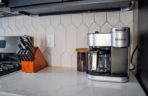 The kitchen is brand new featuring lots of countertop space for meal prep. We provide coffee (Keurig pods and ground coffee), sugar, and basic condiments.