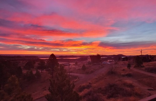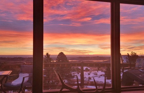 The Red Cedar Chalet is nestled on the edge of Lory State Park, behind Horsetooth Reservoir, offering breathtaking views of the lake, historic downtown Fort Collins, and the northern valley that extends to the Wyoming border. The master bedroom is generously sized, with windows framing stunning vistas. The sunroom provides a cozy spot to relax and enjoy your morning coffee, especially on cooler days, and also features a pull-out couch for extra guests. The expansive living room and kitchen area offer plenty of space, with additional sleeping options available on the convertible lovesac and sofa.