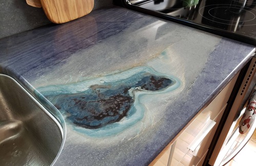 The kitchen, with stainless steel appliances, has beautiful blue macaubre quartzite counters. Breakfast is easy. Outside, you will find a gas grill, chaise lounges, patio furniture and hammock to enjoy the evening BBQ, fire pit and star gazing.