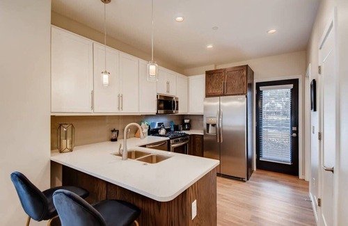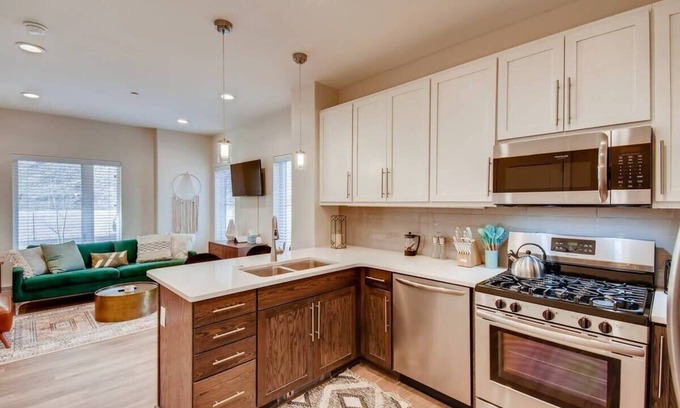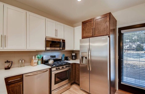 The Hiker’s Haven welcomes you with warm wood tones and a bright, cheery color palate. The oversized windows in the living room let in ample amounts of Colorado sunshine, and the additional recessed ceiling lights will keep you illuminated well after the sun goes down. Sit down and relax in front of the television, or gather around the coffee table with a map to plan your next adventure.
