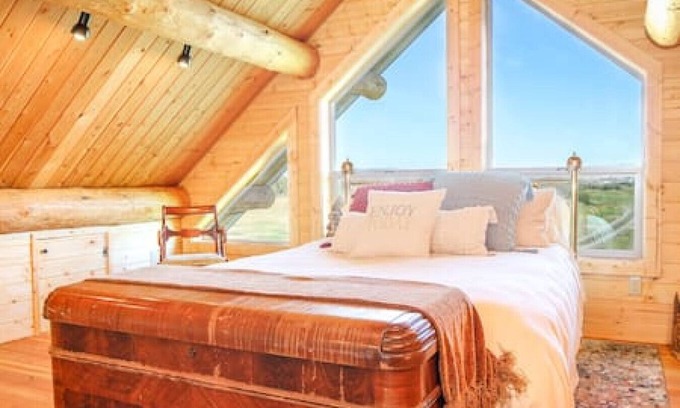 Upstairs, you'll find a gorgeous bedroom with large windows offering stunning views of the surrounding landscapes.