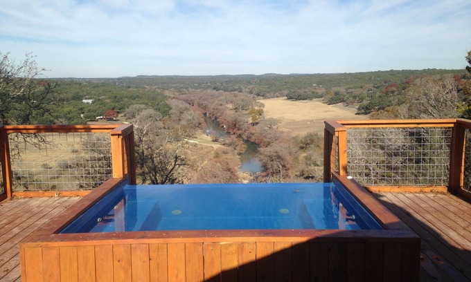 Escape to this classic hill country cabin commanding amazing views and sunsets from a cliff overlooking the Guadalupe River. Enjoy the drive to and from the house through a large ranch hosting exotic and native wildlife. Take in distant views from the deck, relax in the plunge pool ( heated September- May) settle in for an unforgettable stay at this romantic getaway.