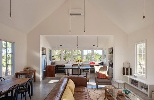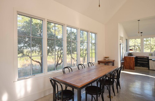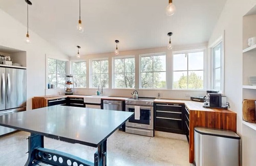 This custom-designed three-bedroom home is perfect for a family or group and features abundant outdoor spaces, including a covered courtyard living area. This home is located in the heart of Hill Country, in Spicewood, close to an array of local wineries, Texas-style dining, and natural springs.