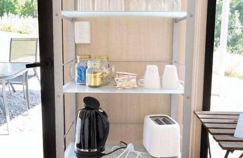 A cozy 139-square-foot tiny home with easy access to water, split air conditioning, a kitchenette, cooking equipment, and excellent bathroom facilities. These amenities include an eco-friendly compost toilet, hand basin, and shower (gas-heated for hot showers).