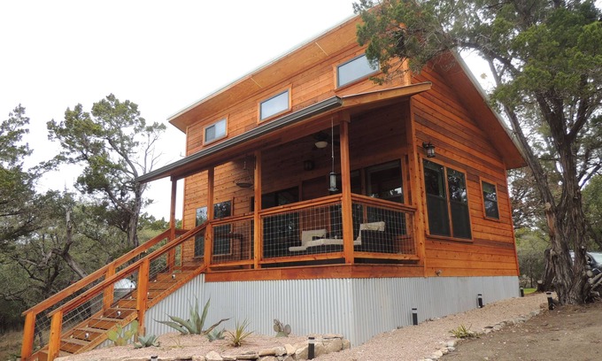 Modern, Creek side cabin with a view of the spring fed waterfall and grotto, is nestled in the Texas Hill country. This custom built cabin is located on a one-of-a-kind, wooded 5 acre property located just 2 miles from the Hamilton Pool Preserve and Reimers Ranch for Hiking, Swimming, Bike Riding, Rock Climbing, kayaking and more. It's within 15 minutes of local breweries, wineries and great places to eat. You can relax creek side on the porch, hammock, by the fire pit and grill out or take advantage of all the outdoor activities and amenities in the area.