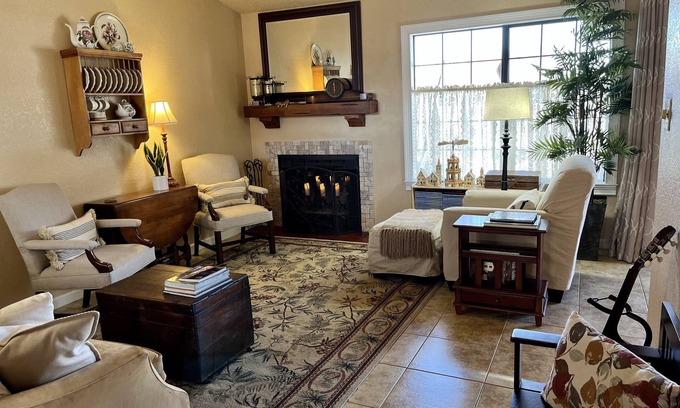The interior is tastefully designed with an eclectic mix of European and South West influences. This townhome has two bedrooms, with a queen size bed in each. There is a full service kitchen, dining room, sitting room, and TV room with a queen size sleeper sofa. There is a folding twin cot in the master bedroom closet as well. The back patio is private and guests are welcome to use the grill with plenty of outdoor seating available. Feel free to fill the hummingbird feeder’s and get your cameras ready for an acrobatic dance. Please read house rules prior to booking your stay.
