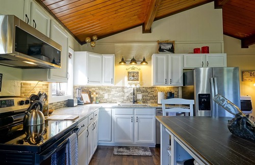 Inside, you'll find a cozy and inviting space with two well-appointed bedrooms, ideal for both adults and children. The cabin blends modern comforts with rustic charm, providing a warm ambiance to unwind after a day of exploring. The open-concept living room and kitchen feature large windows offering breathtaking views, new stainless steel appliances, and comfortable seating—perfect for watching a movie on the Smart TV while taking in the surrounding natural beauty. *Please note that the living room fireplace is not functional. Step outside to enjoy breathtaking views of the mountains from the comfort of your private outdoor space. The master bedroom features a luxurious king bed with a Smart TV, while the second bedroom offers a cozy twin-over-queen bunk bed, also equipped with a Smart TV. Each bed is outfitted with fresh, clean white linens, ensuring a restful night's sleep. Step outside to your private outdoor haven, where you can soak in stunning mountain views. Relax on the deck or in the hammock, or gather around the firepit for a night of s'mores and storytelling under the stars.