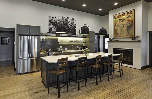 Gather round the 10' island and gas fireplace in the fully equipped SS cook's kitchen, where you can cook and bake - or just warm up those leftovers! Share a cup of coffee, glass of wine, or full meal at the island, seated on original desk seats - or take a seat at the large dining table (seating 6-8) in front of the original chalkboard.
