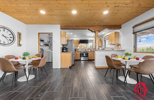Fully equipped kitchen, where wood block counters, ample storage, and high-quality appliances await. Enjoy home-cooked meals in the dining area that accommodates 8 guests across two separate tables.