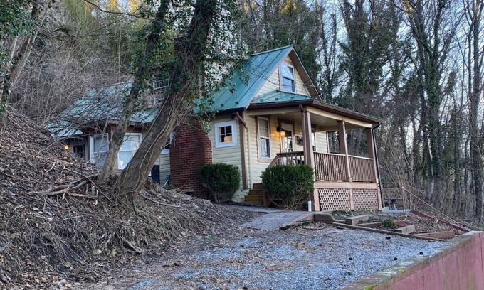 1940’s bungalow, built right into a cliff! The outdoor area is fantastic - up above the street and town, Flagstone patio, gazebo, firepit and eating area with grill. Your own private waterfall too! (Coming in spring) Hear the river year round, and great views in the fall/winter! Watch the train come through the tunnel from the front porch.
