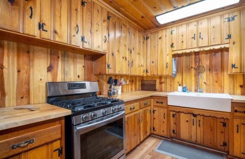 The property features two inviting bedrooms and two full bathrooms, making it a comfortable haven for you and your guests. The master suite boasts a luxurious king bed adorned with organic cotton bedding and a soaking tub in the attached bathroom, while the second bedroom offers a cozy queen bunk bed alongside an extra-long twin bed—perfect for accommodating both adults and children. Enjoy the warmth of the wood-burning stove in the inviting living room or gather on one of the two outdoor decks for dining and savoring the breathtaking views. Your stay will include modern amenities such as high-speed internet, a fully stocked kitchen with farmhouse sink, and even pet-friendly options to include your furry friends in the celebration.