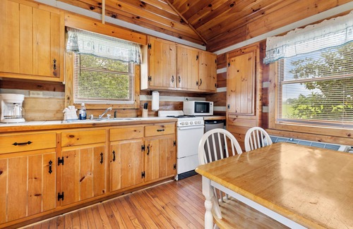 The fully equipped kitchen sits just behind the living area, offering classic wooden cabinetry, a stove and oven, microwave, mini-fridge, and a coffee maker. There's plenty of room to unpack your groceries and prepare a simple meal or snack. A dining table with seating for three makes a great spot for meals or a game of cards.